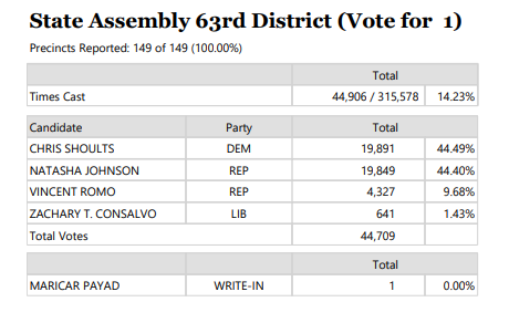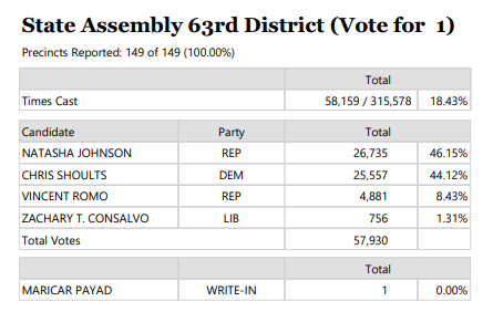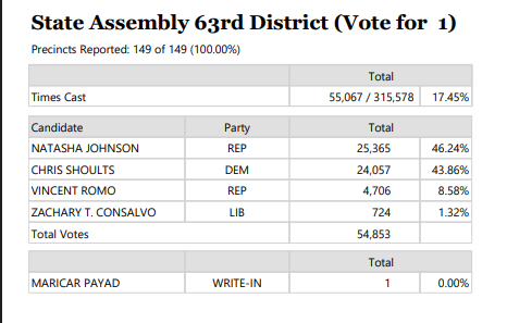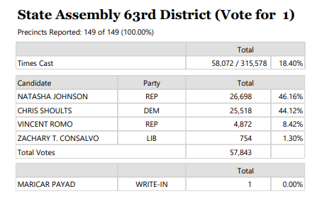 “The Riverside County Registrar of Voters certified the election results Thursday, July 3. Because no one received a majority of the vote, the top two vote-getters — Johnson [46.15%] and Shoults [44.12%] — will advance to an Aug. 26 runoff election.’”